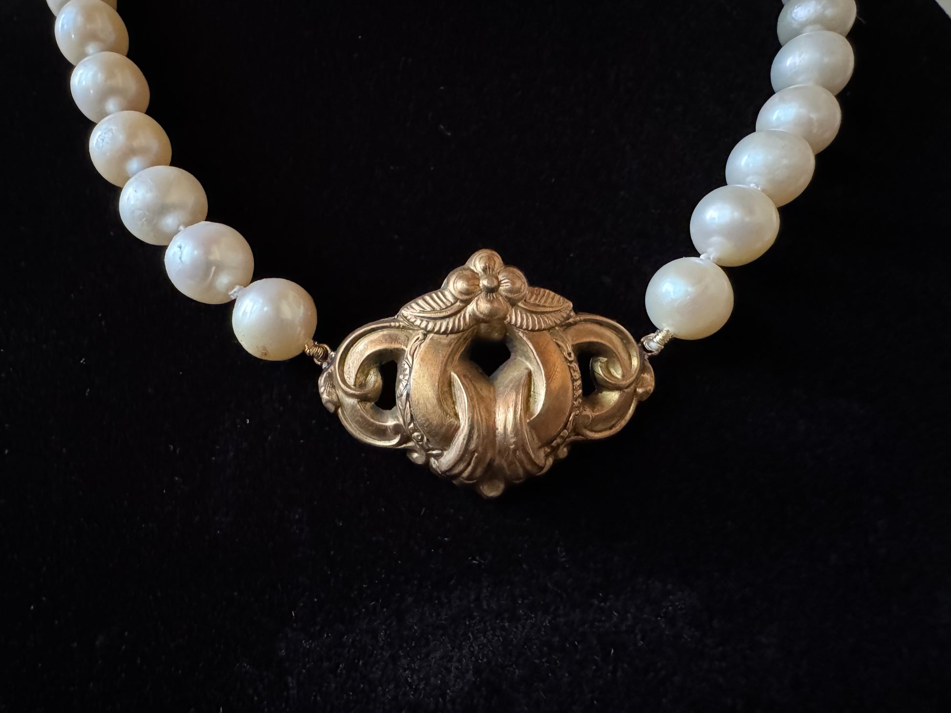 Authentic French gold-filled Art Nouveau brooch, reimagined as a pendant on a 16-inch strand of lustrous freshwater pearls. A graceful fusion of turn-of-the-century artistry and timeless elegance.