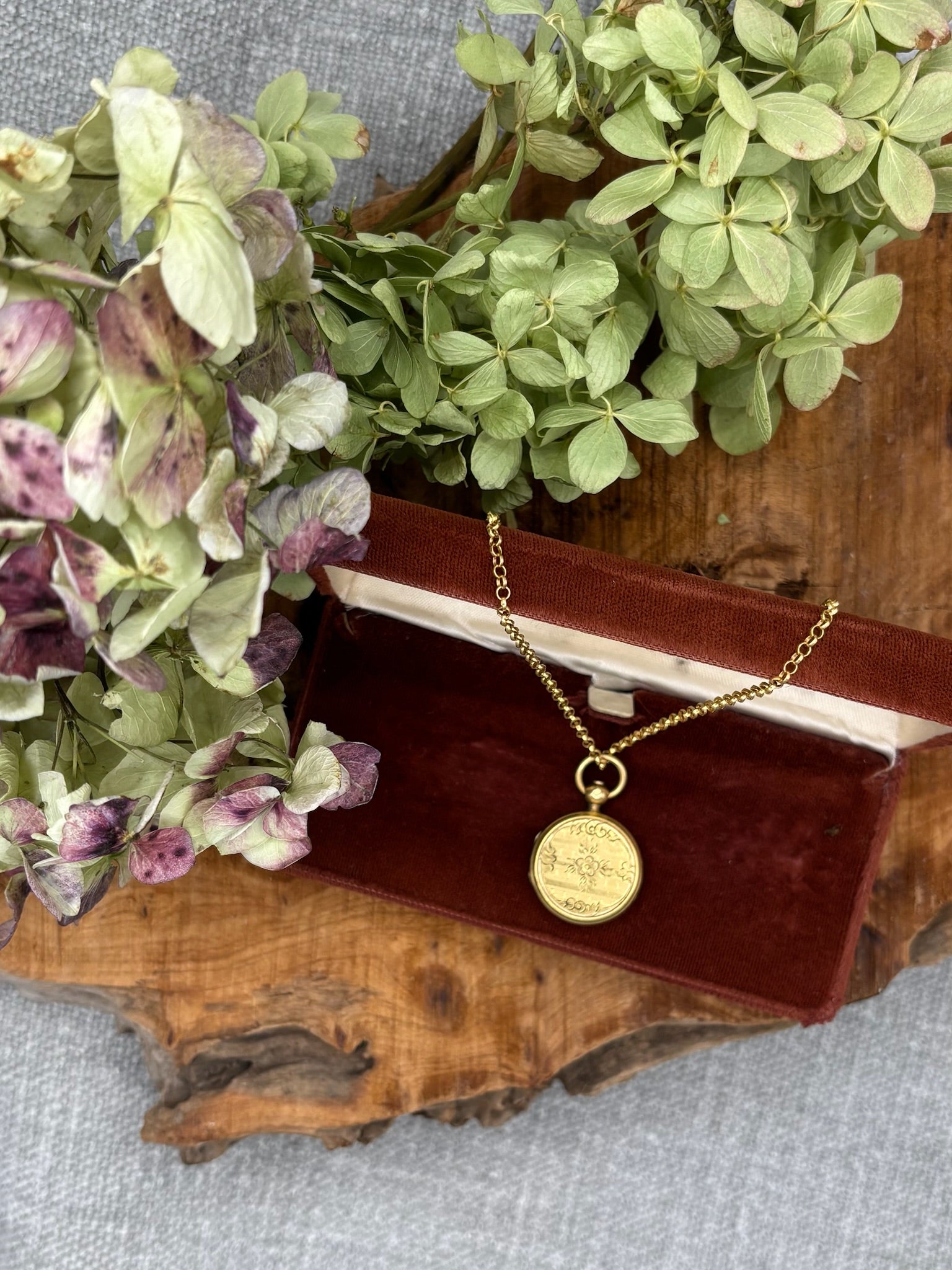 This antique 16" necklace features a gold filled etched locket, suspended from a gold filled rolo chain. The detailed etching adds subtle texture, while the secure chain design provides both durability and elegance.